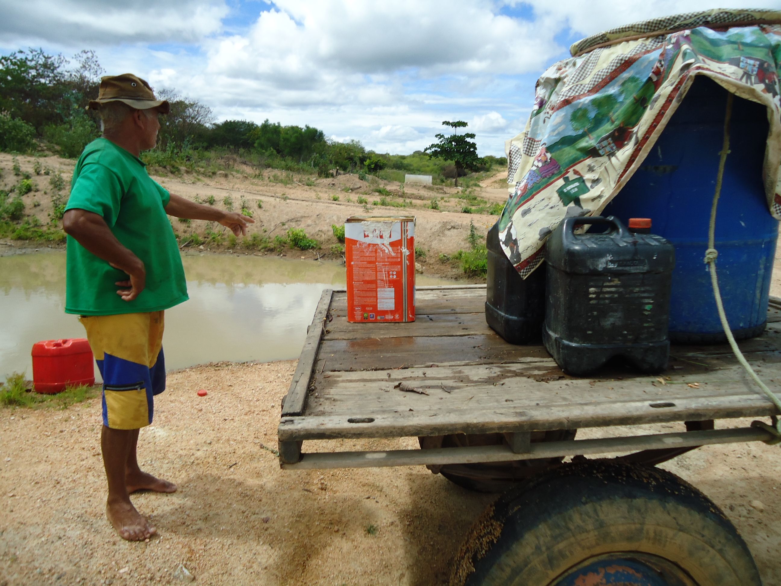 Em abril, as equipes de CPT de Pernambuco realizaram um encontro sobre os impactos dos “grandes projetos” nas comunidades camponesas. Na ocasião foi visitado o lote 12 da Transposição das águas do Rio São Francisco, em Sertânia – Sertão de PE. Nesta visita conhecemos seu Chico, 65 anos, que teve sua casa destruída, a cisterna inutilizada e estava colhendo água de um lamaçal ao lado do canal da transposição (Foto).