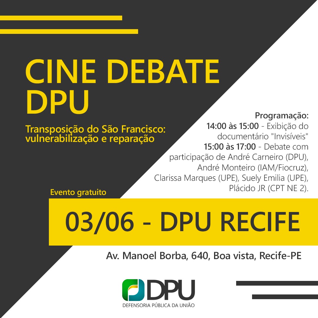 #TransposiçãoDoRioSãoFrancisco | Hoje, dia 03 de junho, às 14h, será realizado o Cine Debate "Transposição do Rio São Francisco: vulnerabilização e reparação". A atividade acontecerá na sede da Defensoria Pública da União (DPU), na avenida Manoel Borba, no Recife.