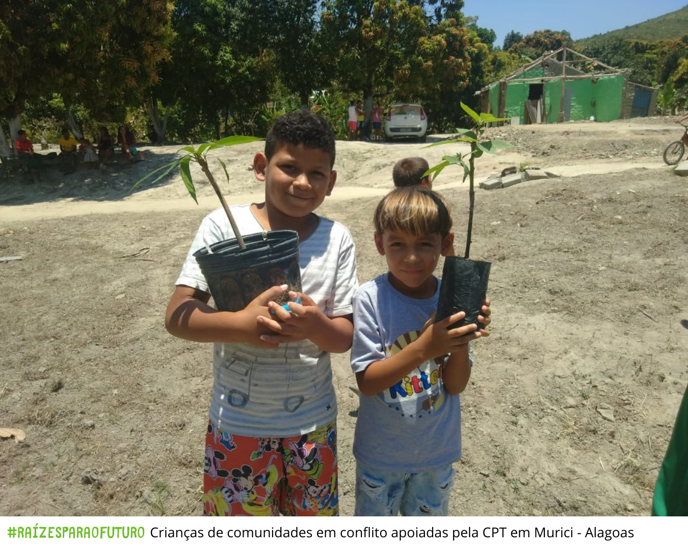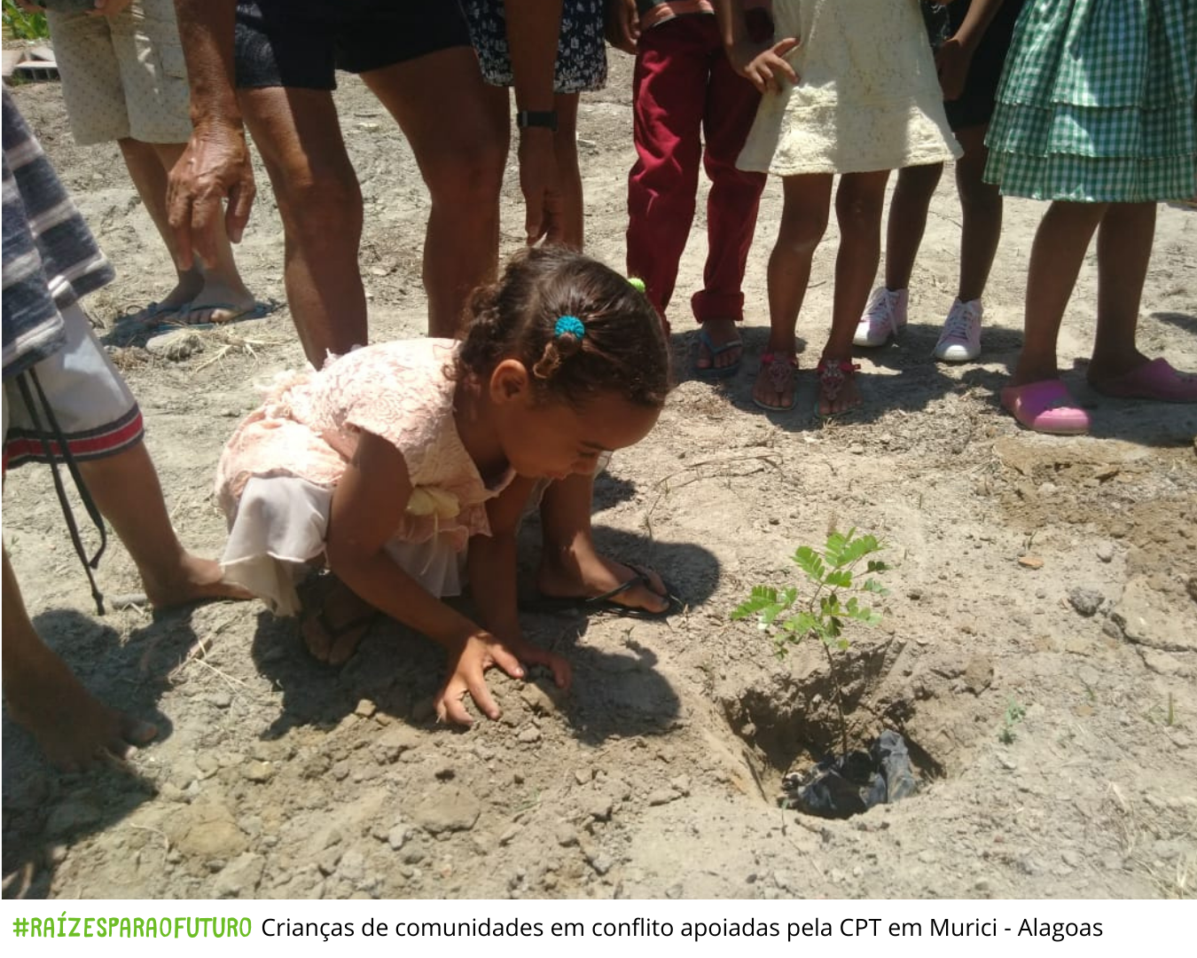 No dia 11 de outubro, em Alagoas, a CPT realizou atividade recreativa e educativa com crianças das comunidades dos acampamentos Bota Velha, Santa Cruz e Mumbuca, localizados no município de Murici, Zona da Mata alagoana. Aproximadamente 40 crianças celebraram, brincaram e plantaram 20 mudas de árvores pau-brasil, ingá, mangueira, abacate, entre outras espécies. “Estou plantando para criar frutos para comer, para nós crescermos saudáveis, para vender os frutos e ganhar um dinheirinho. É isso! A fruta é sagrada, o pé, a natureza...”, disse o menino Edgar Ferreira, nove anos. Já Pedro Miguel, 9 anos, falou que planta para ter sombra, proteger-se do sol e descansar embaixo da árvore. A atividade foi encerrada com um almoço coletivo na comunidade de Bota Velha, acampamento que resiste há mais de 20 anos a ameaças de despejo.