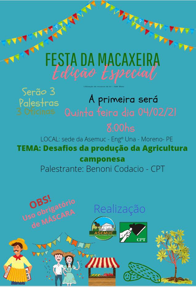 A Festa da Macaxeira, realizada anualmente pela comunidade do Una, em Moreno (PE), ganhará um novo formato em 2021. Em razão da pandemia da Covid-19, a tradicional celebração com forró pé de serra dará lugar a ações de formação, com um ciclo de três palestras e três oficinas. A medida foi uma alternativa encontrada pelas famílias para evitar aglomerações e ao mesmo tempo manter o calendário de celebração da produção do alimento.