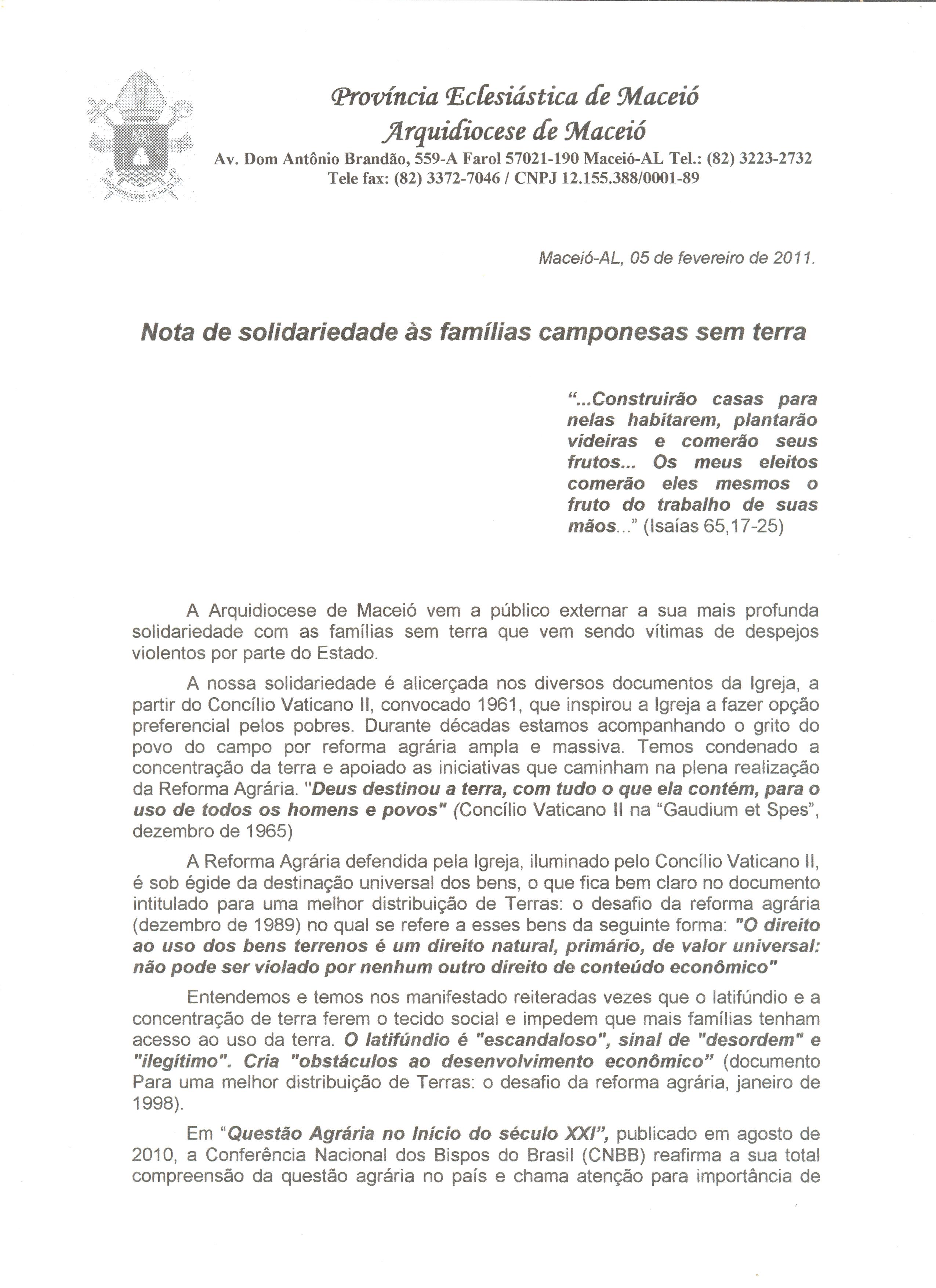 No mês passado, cerca de 200 famílias sem terra foram despejadas de terras consideradas improdutivas e a Arquidiocese de Maceió divulgou nota pública em solidariedade