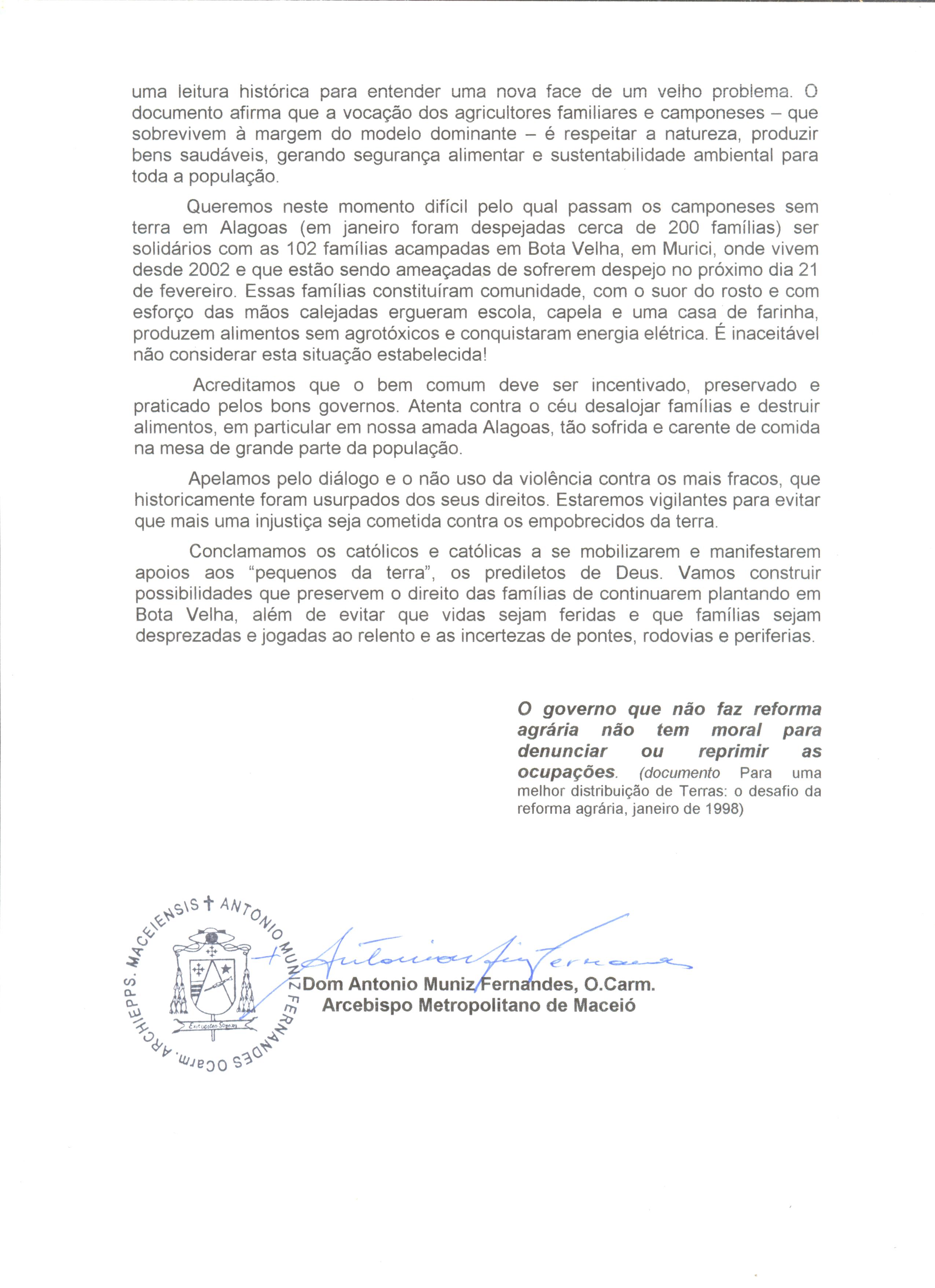 No mês de janeiro foram retiradas cerca de 200 famílias de terras consideradas improdutivas e vários hectares de alimentos foram destruídos, de áreas onde os camponeses já vivem em comunidade por mais de cinco anos. A Arquidiocese de Maceió também declarou apoio às 102 famílias camponesas do Acampamento Bota Velha no município de Murici, que é acompanhado pela CPT-AL desde 2002, e poderia ser transformado em assentamento, já que possui escola, capela, casa de farinha, açude, casas com energia elétrica e boa produção. A reintegração de posse foi concedida pelo Juiz Agrário Ayrton Tenório e estar prevista para acontecer no dia 21 de fevereiro, e os camponeses não tem para onde ir.