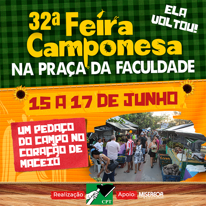 A Feira Camponesa vai retornar à Praça Afrânio Jorge, mais conhecida como Praça da Faculdade, em Maceió (AL), nos dias 15, 16 e 17 de junho, em ritmo de São João. Trata-se da 32ª edição no formato com mais bancas de alimentos saudáveis que na sua versão itinerante. Haverá restaurante camponês, casa de farinha, shows em palco e debates temáticos.