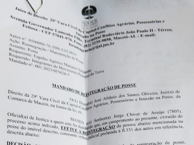 De acordo com o mandado assinado pelo juiz de direito José Afrânio dos Santos Oliveira: “No prazo, deverão retirar barracos e demais construções e fazer a colheita dos produtos por eles plantados, se houver, sem praticar qualquer tipo de danificação. Não realizada a desocupação de forma voluntária, ressalto que a reintegração será feita de forma compulsória com o uso da força policial, caso seja necessário".