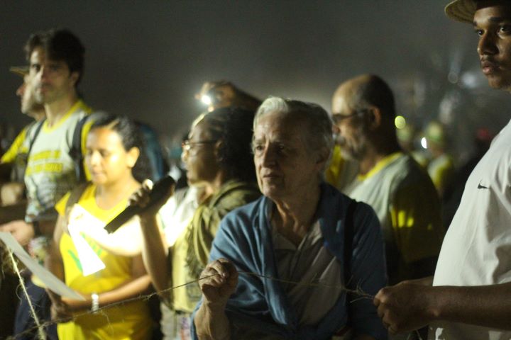 Após a celebração, o público foi animado por um encontro musical com o poeta e cantor Zé Vicente, cujas canções de fé, luta e liberdade ecoaram entre crianças, jovens, adultos e idosos. Em sua apresentação, Zé abriu uma grande bandeira do Brasil, que foi balançada pelos presentes e circulou o espaço ao som da música “Quando o dia da paz renascer”. Animados, os peregrinos e as peregrinas partiram em caminhada.
