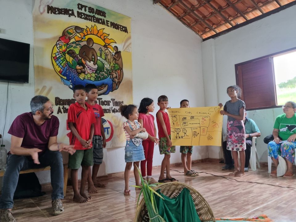 O momento de fofura veio com a apresentação do grupo de trabalho das crianças. As crianças presentes escolheram falar o que é a CPT para elas. Dandara, filha da camponesa Maria do Bosque, explicou o que eles desenharam no cartaz: "Aqui desenharam um acampamento com árvores, uma casa, uma flor, árvores, frutas".