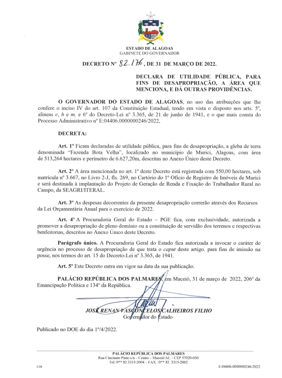 Naquele momento, o então governador Renan Filho (MDB) assumiu publicamente o compromisso de adquirir a área, diante da omissão do governo federal. O compromisso se materializou em 31 de março de 2022, quando o Estado de Alagoas publicou o Decreto nº 82.176, declarando de utilidade pública, para fins de desapropriação, a Fazenda Bota Velha, com área total de 513,264 hectares, destinada à implantação de um projeto de geração de renda e fixação do trabalhador e da trabalhadora rural no campo.