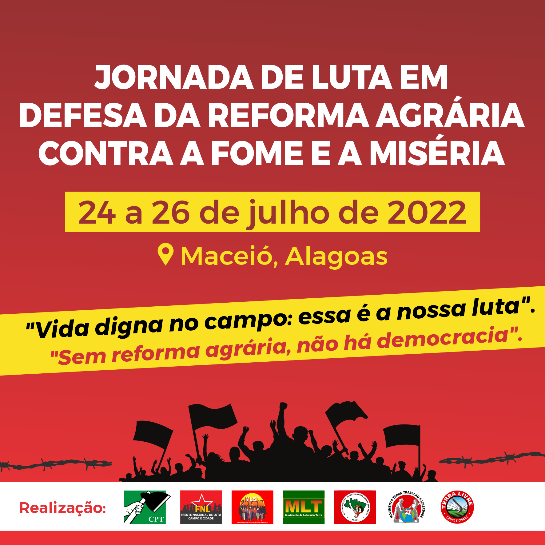 De 24 a 26 de julho, vai acontecer uma jornada de luta em defesa da reforma agrária e contra a fome e a miséria em Maceió. Com o tema “Vida digna: essa é a nossa luta”, a iniciativa, realizada por sete organizações do campo, conta com uma programação de atividades de mobilização e ações de solidariedade.