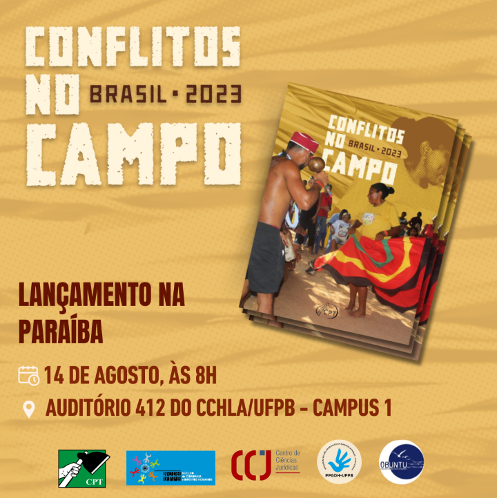 Na Paraíba, o lançamento da publicação Conflitos no Campo Brasil 2023 será realizado no dia 14 de agosto, às 9h, no auditório 412 do Centro de Ciências Humanas, Letras e Artes (CCHLA) da Universidade Federal da Paraíba (UFPB), em João Pessoa. A Comissão Pastoral da Terra (CPT), junto com o OBUNTU e o PPGDH/UFPB, divulgará os dados de conflitos no campo no estado e em todo o país.
