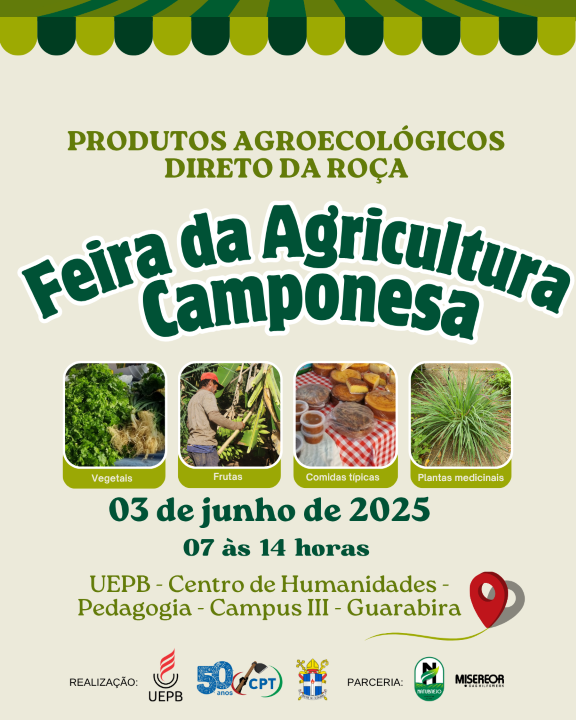 O Centro de Humanidades (CH) da Universidade Estadual da Paraíba (UEPB), Câmpus III, localizado em Guarabira, e a Comissão Pastoral da Terra da Diocese de Guarabira promovem, no dia 3 de junho, das 7h às 14h, a 1ª Feira da Agricultura Camponesa. O evento acontece nas dependências do CH como parte do projeto de extensão "Mulher e Juventudes Camponesas: protagonismo e empoderamento das mulheres e jovens na sua emancipação cidadã".