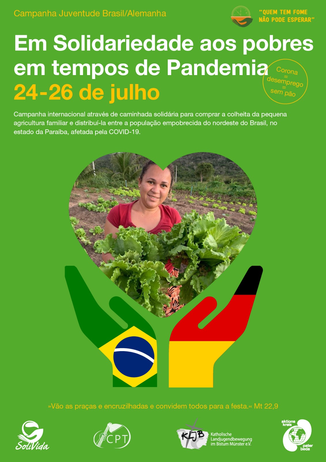 Jovens de mais de cinquenta comunidades camponesas acompanhadas pela CPT na Paraíba, Brasil, e jovens da Alemanha estarão mobilizados nos próximos dias 24, 25 e 26 de julho para realizar a Campanha “Em solidariedade aos pobres em tempos de pandemia”. Com o lema: “Vão às praças e encruzilhadas e convidem todos para a festa (Mt 22,9)”, a campanha terá várias ações nos dois países.