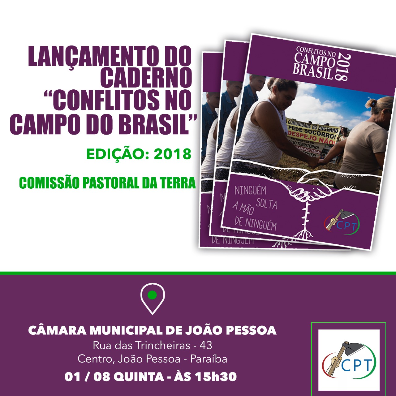 A Comissão Pastoral da Terra tem a satisfação de convidar todos e todas para o lançamento do Caderno Conflitos no Campo Brasil 2018, a ser realizado em Sessão Especial na Câmara Municipal de João Pessoa/PB, no dia 01 de agosto, às 15h30. A publicação apresenta dados precisos dos conflitos agrários no país, que vitimizam povos da Terra, das águas e das florestas.