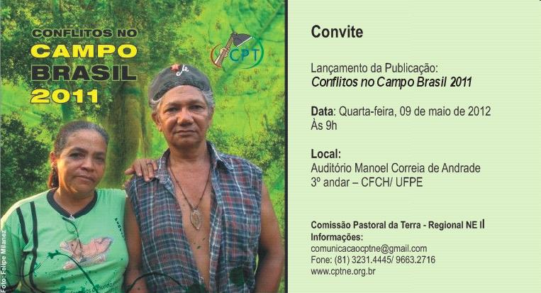 Nesta próxima quarta-feira, dia 9 de maio, a Comissão Pastoral da Terra lançará, em Recife, a sua publicação anual Conflitos no Campo Brasil 2011. Esta é a 27ª edição do relatório que concentra os registros das ações de resistência, conflitos e violências sofridas pelos trabalhadores e trabalhadoras rurais e comunidades camponesas em todo o país. O lançamento será às 9h, na Universidade Federal de Pernambuco (Auditório Manoel Correia de Andrade, 3. andar do CFCH).