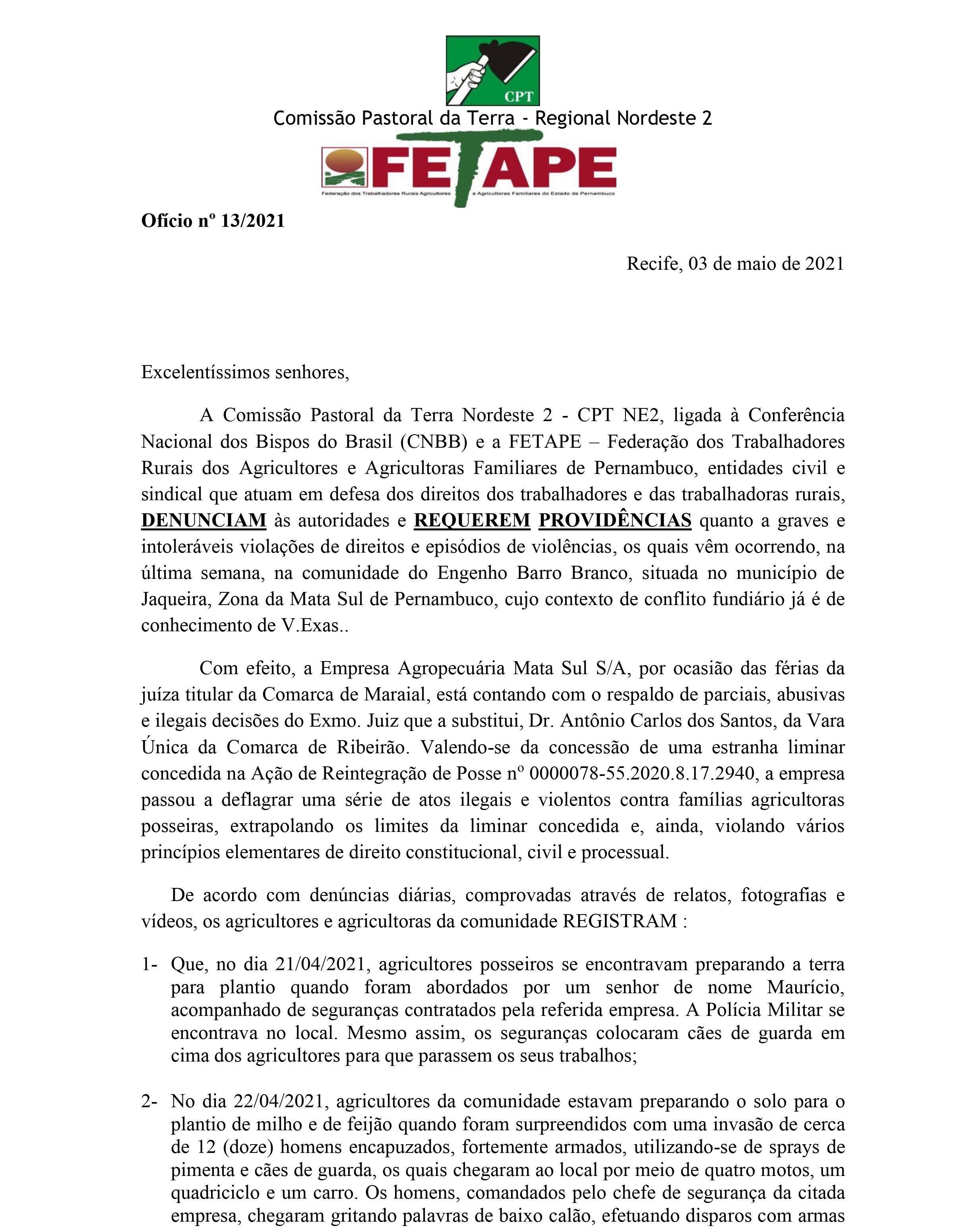 A Comissão Pastoral da Terra (CPT) e a FETAPE cobraram formalmente de autoridades pernambucanas a implementação de medidas urgentes para apurar e conter as violações de direitos humanos e as ameaças ocorridas na comunidade de Barro Branco, em Jaqueira, Mata Sul de Pernambuco. No documento, as entidades também apresentam detalhes das violências denunciadas pelos agricultores e agricultoras da localidade.