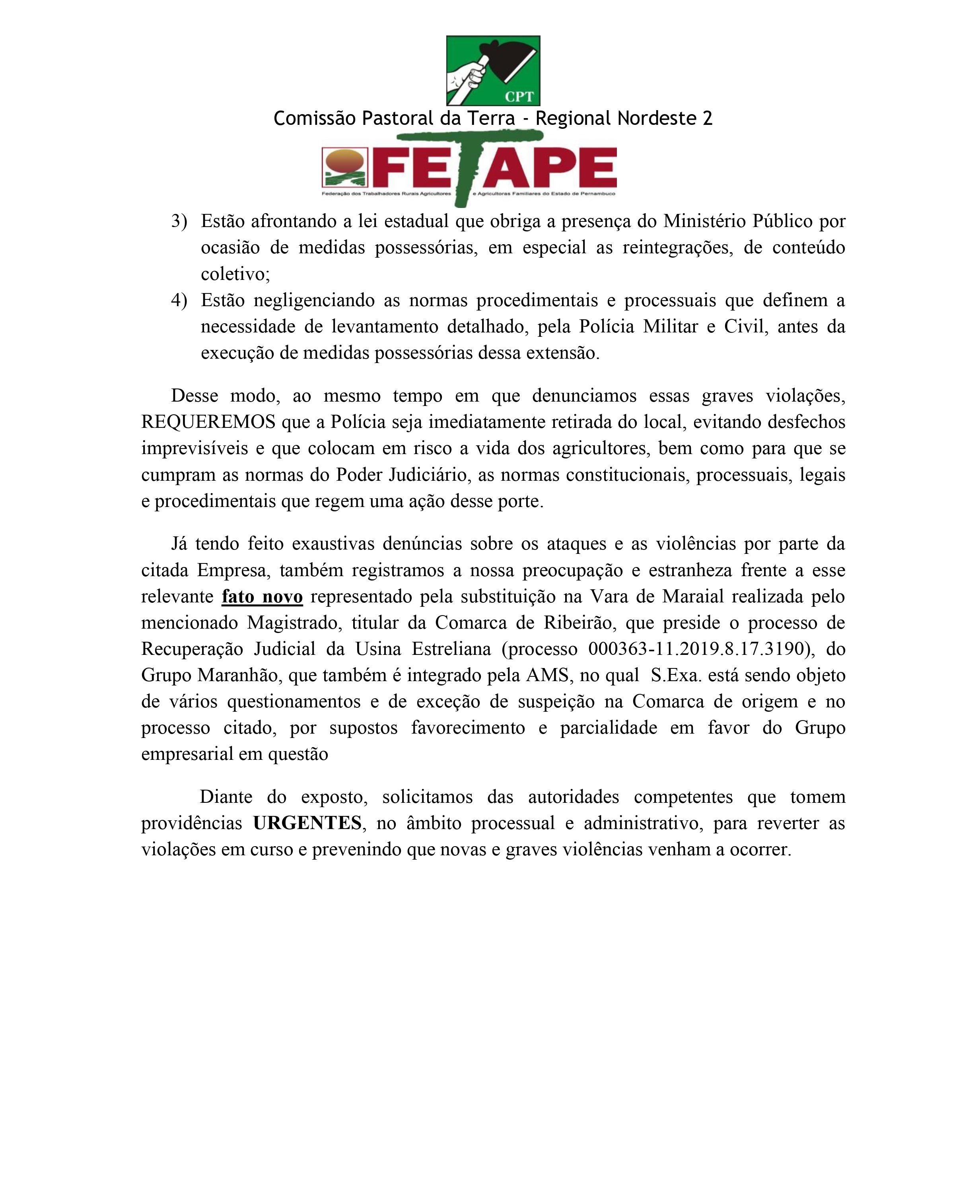 A denúncia foi encaminhada ao Procurador Geral de Justiça, Paulo Augusto de Freitas Oliveira, à Promotoria Agrária do Ministério Público de Pernambuco, Edson Guerra, ao Secretário Estadual de Justiça e Direitos Humanos, Pedro Eurico, ao Secretário da Casa Civil, José Neto, ao Secretário Estadual de Desenvolvimento Agrário, Claudiano Martins Filho, ao Secretário Estadual de Defesa Social, Antônio de Pádua, ao Defensor Público Geral de Pernambuco, José Fabrício Silva de Lima, ao Procurador Geral do Estado, Ernani Medicis Pinto, ao presidente da Comissão de Agricultura da Assembleia Legislativa de Pernambuco, Deputado Doriel Barros, ao presidente da Comissão de Direitos Humanos da Câmara dos Deputados, Deputado Carlos Veras, ao Corregedor Geral do Tribunal de Justiça de Pernambuco, o desembargador Luíz Carlos Figueirêdo, e ao presidente do Tribunal de Justiça de Pernambuco, o desembargador Fernando Cerqueira.
