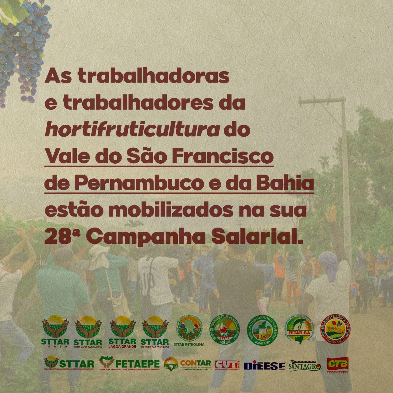 As trabalhadoras e trabalhadores da hortifruticultura do Vale do São Francisco (VSF) - que compreende municípios da Bahia e de Pernambuco - estão mobilizados(as) na sua 28º Campanha Salarial. Desde fevereiro/2022, a categoria vem se reunindo com a bancada patronal no intuito de reivindicar melhores condições de trabalho e salário digno, que lhes possibilite alimentar suas famílias e sustentar seus filhos e filhas.