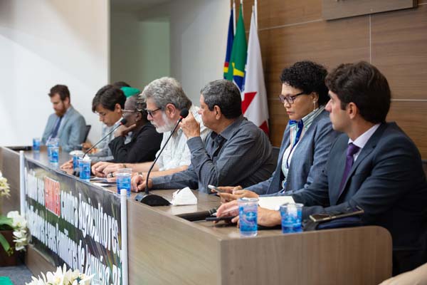 Compuseram a mesa da audiência o relator Marcelo Chalréo e a relatora Sandra Andrade, do CNDH; Geovani Leão, da CPT; Cícera Nunes, presidenta da Fetape; Alair Luiz dos Santos, diretor de Política Agrária da Contag; Antônio Crioulo, da Conaq; Mona Lisa Duarte, Procuradora da República em Pernambuco; José Fernandes, da Defensoria Pública do Estado (DPE); André Carneiro Leão, defensor regional de Direitos Humanos de Pernambuco (DRDH/PE); Renan Castro, da Comissão de Direitos Humanos da OAB-PE.
