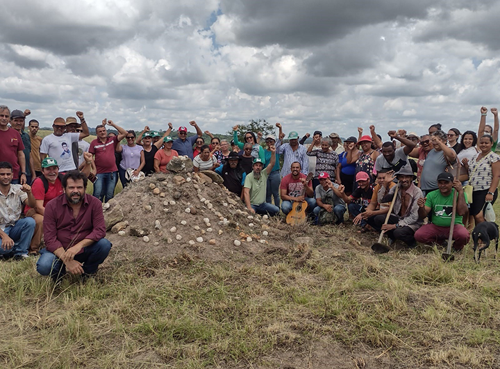 No alto, reuniram-se os/as representantes das comunidades de Itambé: do Gongo, Paraguaçu, São Lourenço e São Bento; de Tracunhaém: Chico Mendes, Ismael Felipe e Nova Canaã; de Aliança: Belo Horizonte, Dom Helder e Mariano Sales; de Lagoa de Itaenga, Sítio Marreco; e da Mata Sul, de Jaqueira: a comunidade de Fervedouro. Eles/elas formaram uma grande roda e falaram dos desafios e lutas que estavam enfrentando. Ao final, colocaram pedras numa tuia de terra no formato de cone, no centro da roda e gritaram: “Padre Tiago, ontem, hoje e sempre. Presente, Presente, Presente!”. Assim, iniciou-se a construção do monumento dos mártires. A ideia é que aconteçam mais caminhadas para o Monte Sagrado e outras pedras sejam colocadas. Na ocasião também foram plantadas árvores nativas da Mata Atlântica.
