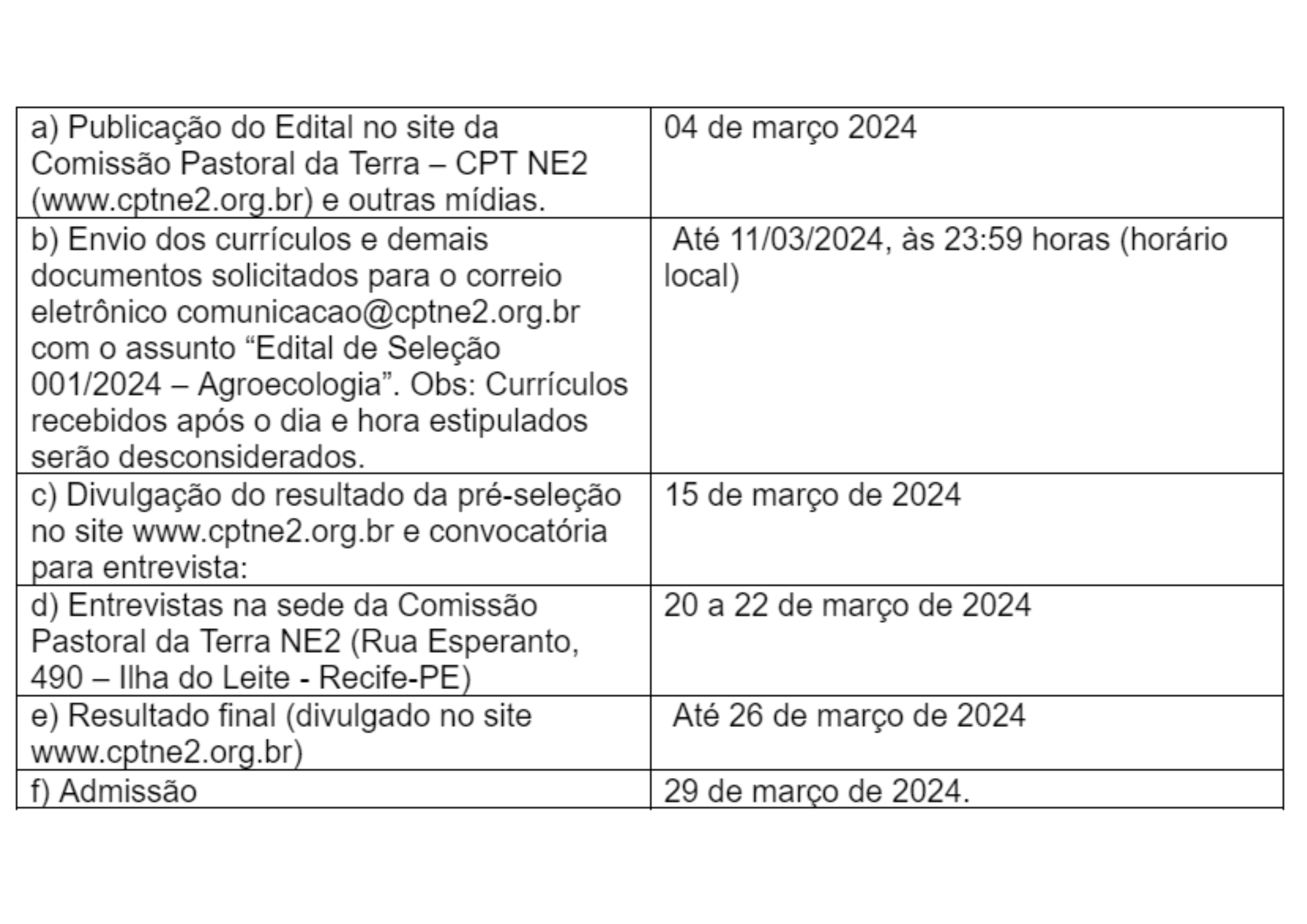 A Comissão Pastoral da Terra – CPT, vinculada à Conferência Nacional dos Bispos do Brasil (CNBB), torna pública a realização do PROCESSO SELETIVO SIMPLIFICADO para contratação de profissional para atuar na execução do Projeto APOIO A COMUNIDADES CAMPONESAS NO BRASIL POR MEIO DO FORTALECIMENTO DE PRÁTICAS AGROECOLÓGICAS, desenvolvido na Zona da Mata Norte de Pernambuco, em assentamentos de Reforma Agrária e comunidade de posseiros e posseiras.