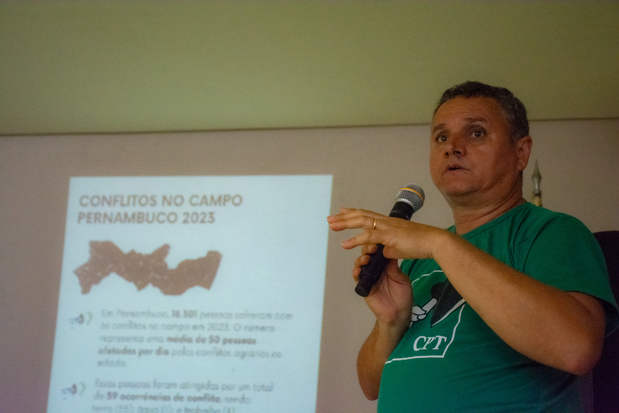 Conflitos no campo em Pernambuco - Durante o lançamento estadual da publicação Conflitos no Campo Brasil 2023, o auditório do Incra ficou tomado pela presença dos agricultores, agricultoras, representantes de organizações sociais do campo, de universidades, órgãos de governo e amigos e amigas da CPT. Geovani Leão apresentou os dados dos conflitos, com uma série de detalhamentos sobre os diferentes tipos de violência sofrida pelas populações do campo no estado.