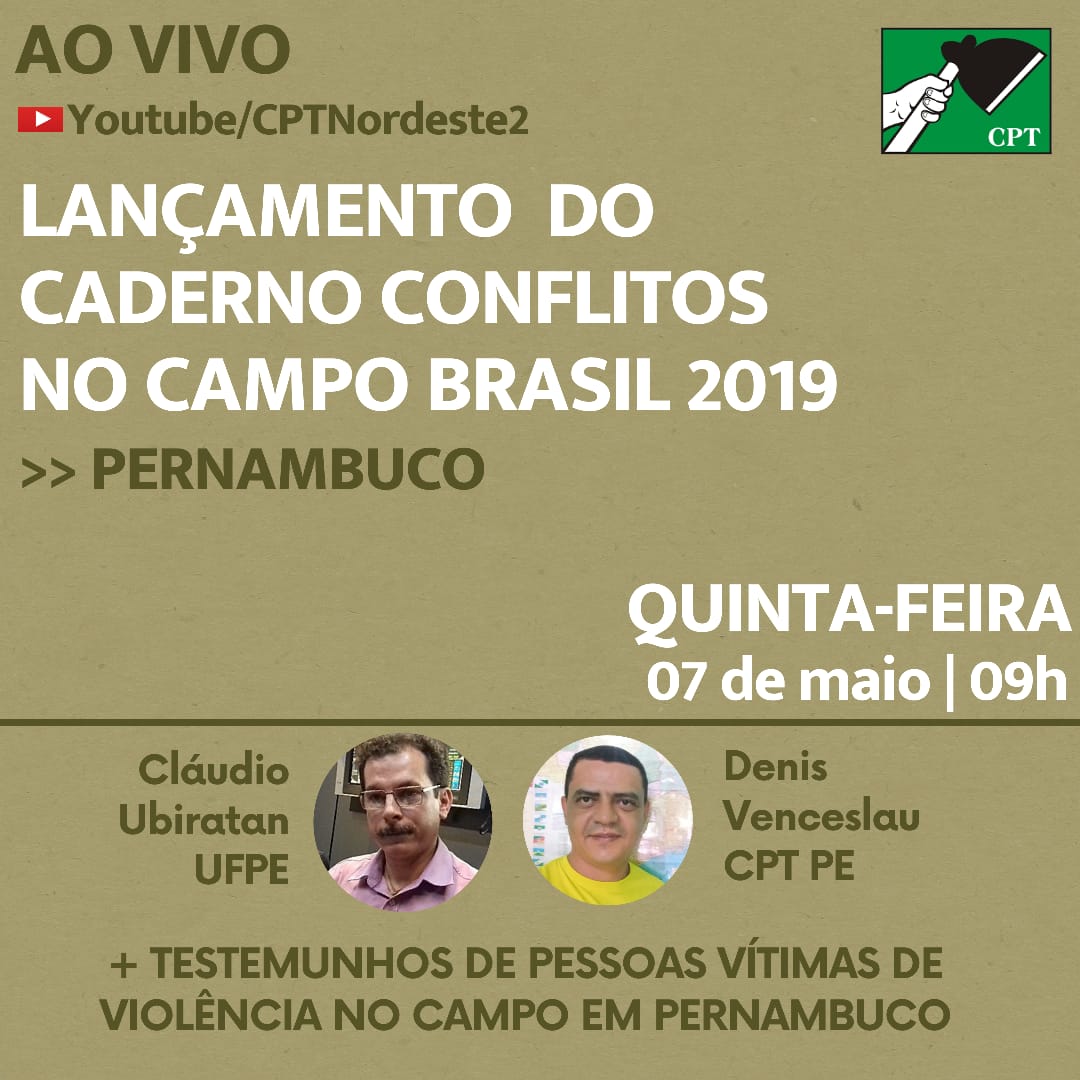 Nesta próxima quinta-feira, dia 07/05, às 9h, a Comissão Pastoral da Terra em Pernambuco realizará o lançamento do Caderno de Conflitos no Campo Brasil 2019. Devido à pandemia do Covid19, o lançamento será feito por meio de transmissão ao vivo no canal da CPT Nordeste 2 no Youtube.