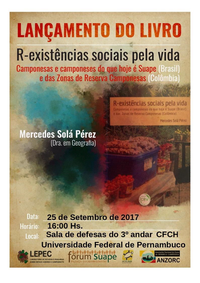 O Laboratório de Estudos e Pesquisas sobre Espaço Agrário e Campesinato (LEPEC) vinculado ao Programa de Pós-Graduação em Geografia e ao Departamento de Geografia da UFPE convida a todos para o lançamento do livro: “R-EXISTÊNCIAS SOCIAIS PELA VIDA: camponesas e camponeses do que hoje é Suape (Brasil) e das zonas de reserva camponesas (Colômbia)” de autoria de Mercedes Solá Perez.