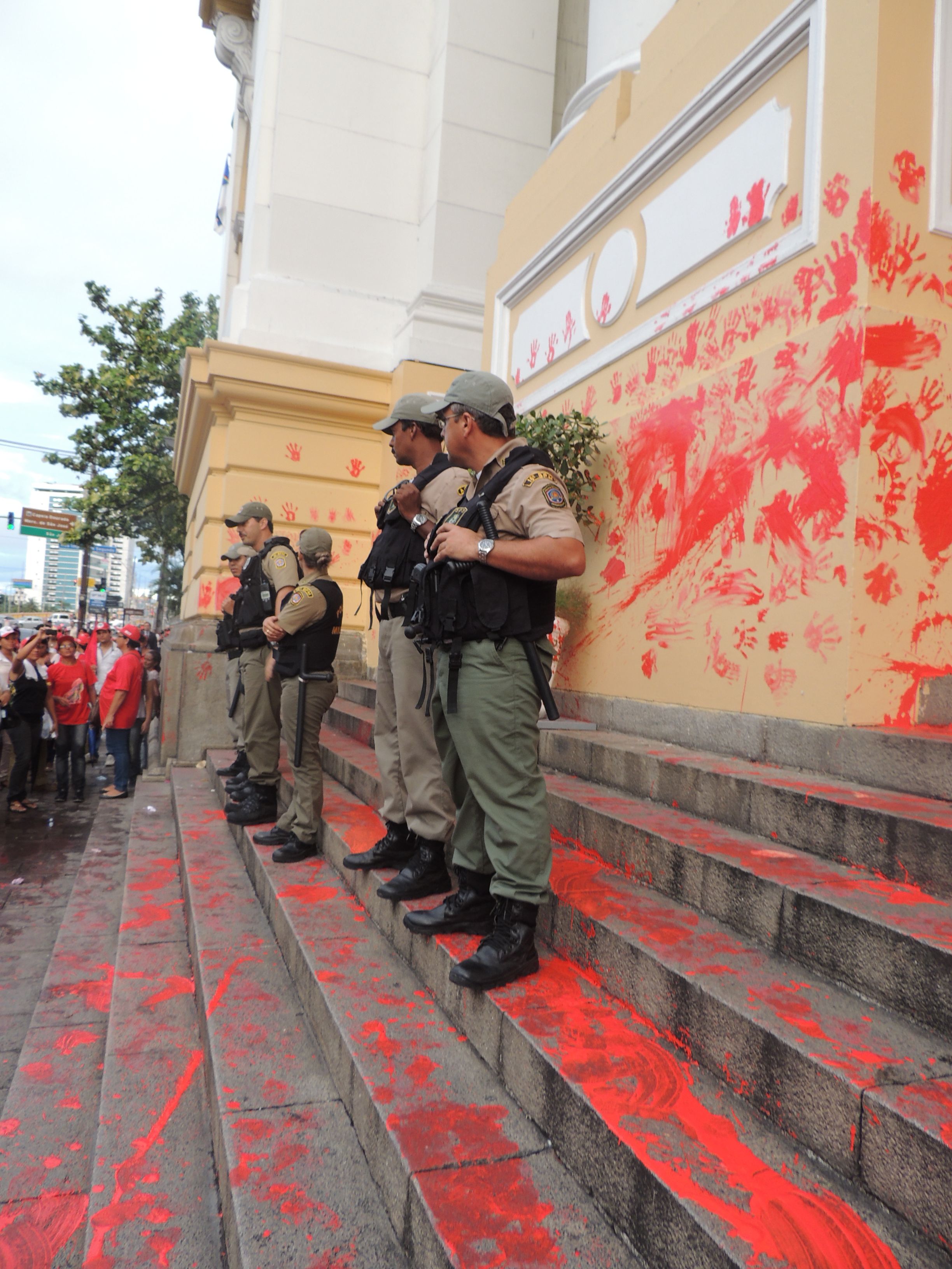 Ao final de um dia de mobilizações na cidade do Recife, as mulheres da Via Campesina marcaram de vermelho a fachada do Tribunal de Justiça de Pernambuco. A cor remete simbolicamente ao sangue e à violência sofrida pelos trabalhadores e trabalhadoras rurais no estado. Durante o ato, não houve confronto com a Polícia.