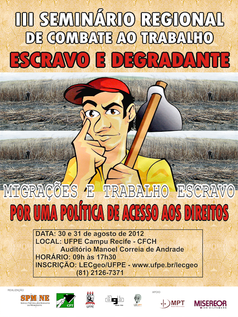 A terceira edição do Seminário Regional de Combate ao Trabalho Escravo e degradante: Migrações e Trabalho Escravo – Por uma política de acesso à Direitos foi iniciada hoje às 9 horas e segue até amanhã. A atividade está acontecendo, no auditório Térreo do Centro de Filosofia e Ciências Humanas - Universidade Federal de Pernambuco/UFPE.